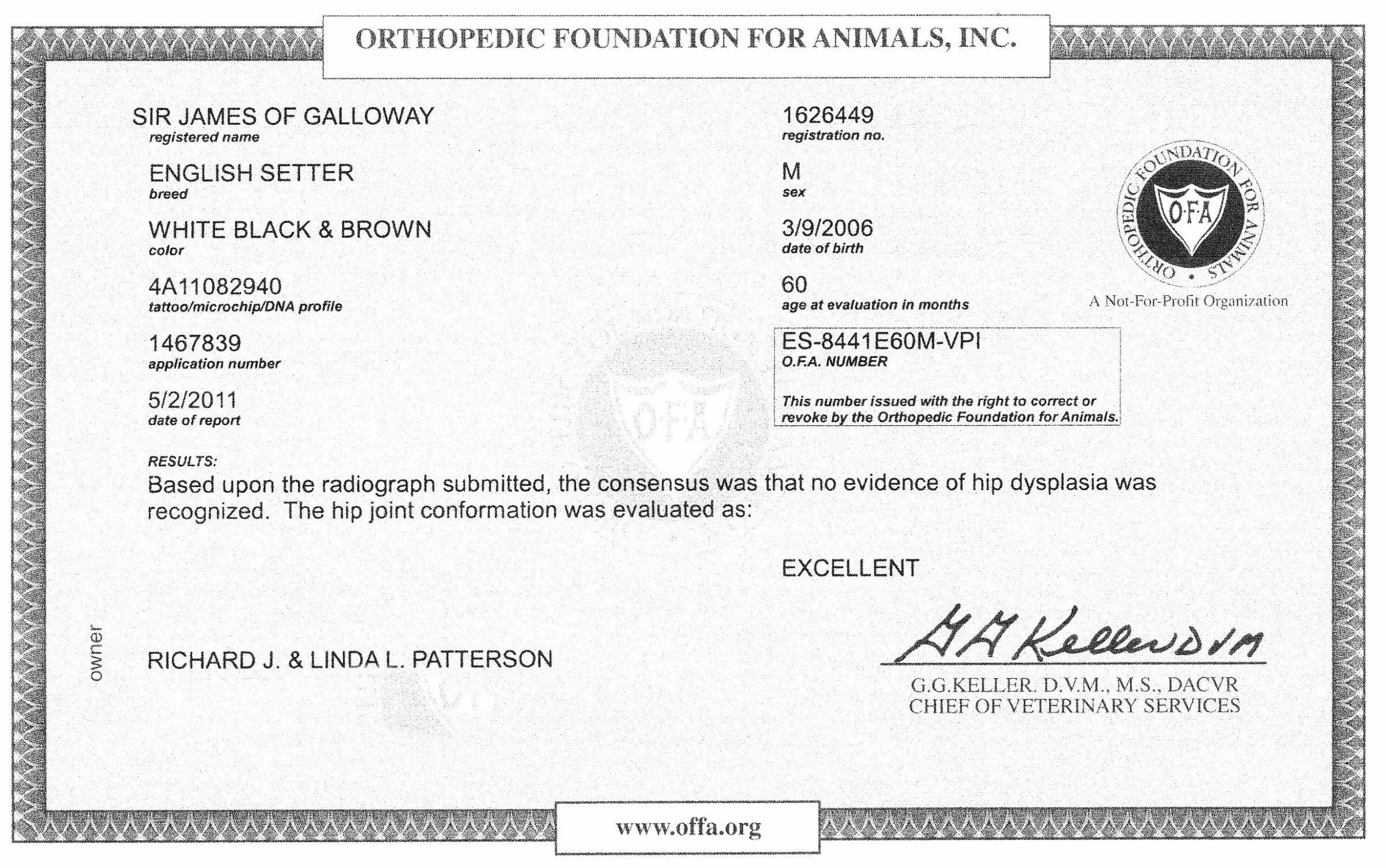 Jimmy has been certified free of hip dysplasia (HD). Based upon the radiograph submitted to the OFA, the consensus was that no evidence of hip dysplasia was recognized and was given the highest rating for hip joint conformation of EXCELLENT.
