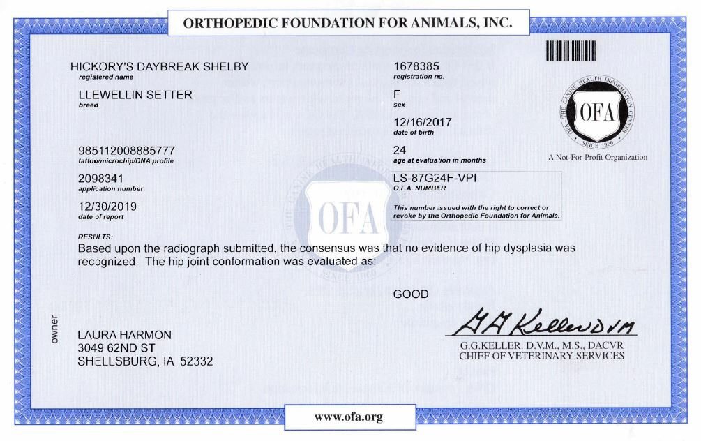 Shelby has been certified free of hip dysplasia (HD). Based upon the radiograph submitted to the OFA, the consensus from three different vets was that no evidence of hip dysplasia was recognized and that hip joint conformation was within normal limits.